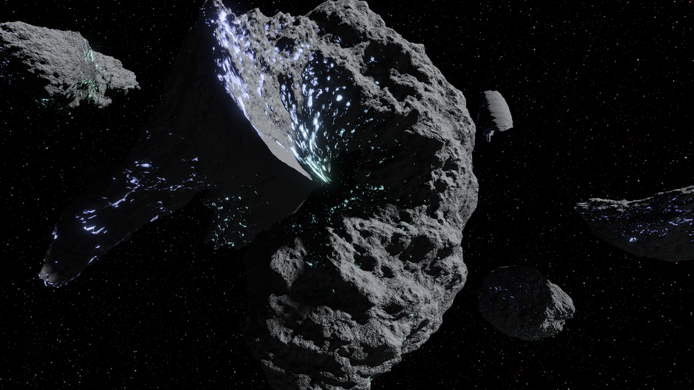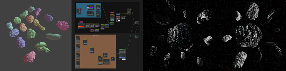 Here you can grab the .blend file with 16 asteroids and a procedural shader.